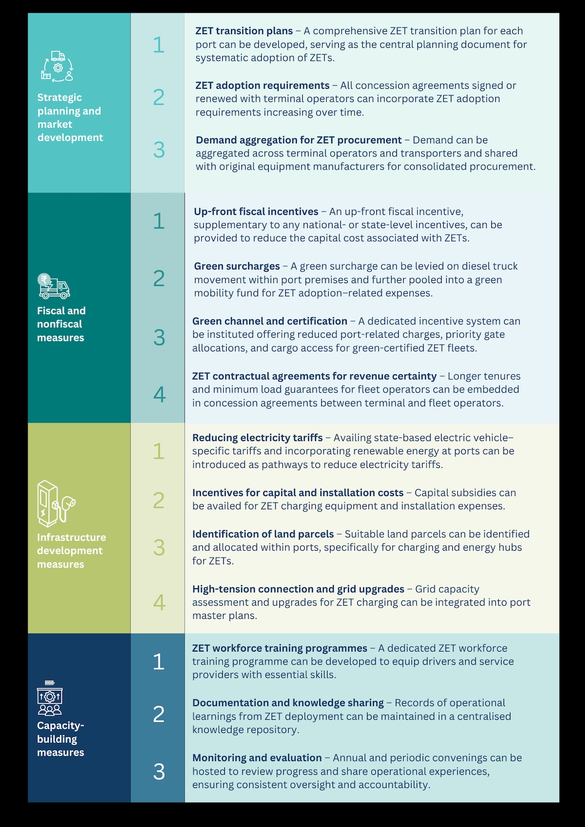 Additionally, fiscal measures such as up-front incentives can help lower the TCO and spur short-term adoption. These can be accompanied with nonfiscal measures, including the creation of green entry and exit channels for ZETs and the introduction of longer-term logistics service contracts favoring ZET operations. Finally, ports can also explore leveraging state EV tariffs and PM E-Drive charging infrastructure incentives to reduce charging-related costs. Capacity-building and workforce training programs should be prioritized to ensure drivers are equipped to operate ZETs efficiently.