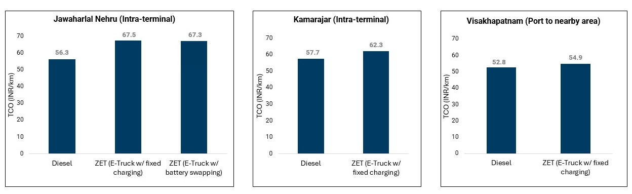 Note: The results are inclusive of PM E-DRIVE E-truck incentives. Daily distance traveled (km) for Jawaharlal Nehru, Kamarajar, and Visakhapatnam ports is 125 km, 120 km, and 150 km, respectively.