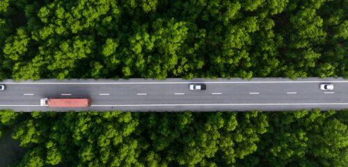 Aerial top view of car and truck driving on highway road in green forest. Sustainable transport. Drone view of hydrogen energy truck and electric vehicle driving on asphalt road through green forest.