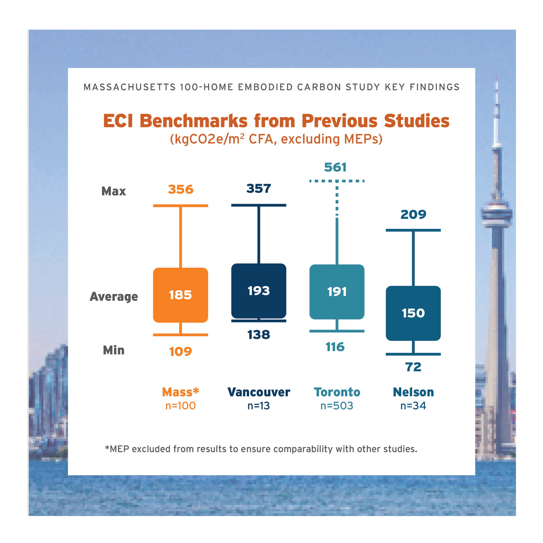 The outcomes of multi-home studies in Canada by Builders for Climate Action reveal average embodied carbon intensity (ECI) values comparable to those observed in Massachusetts. The results studies show similar outliers at both the high- and low- ends.