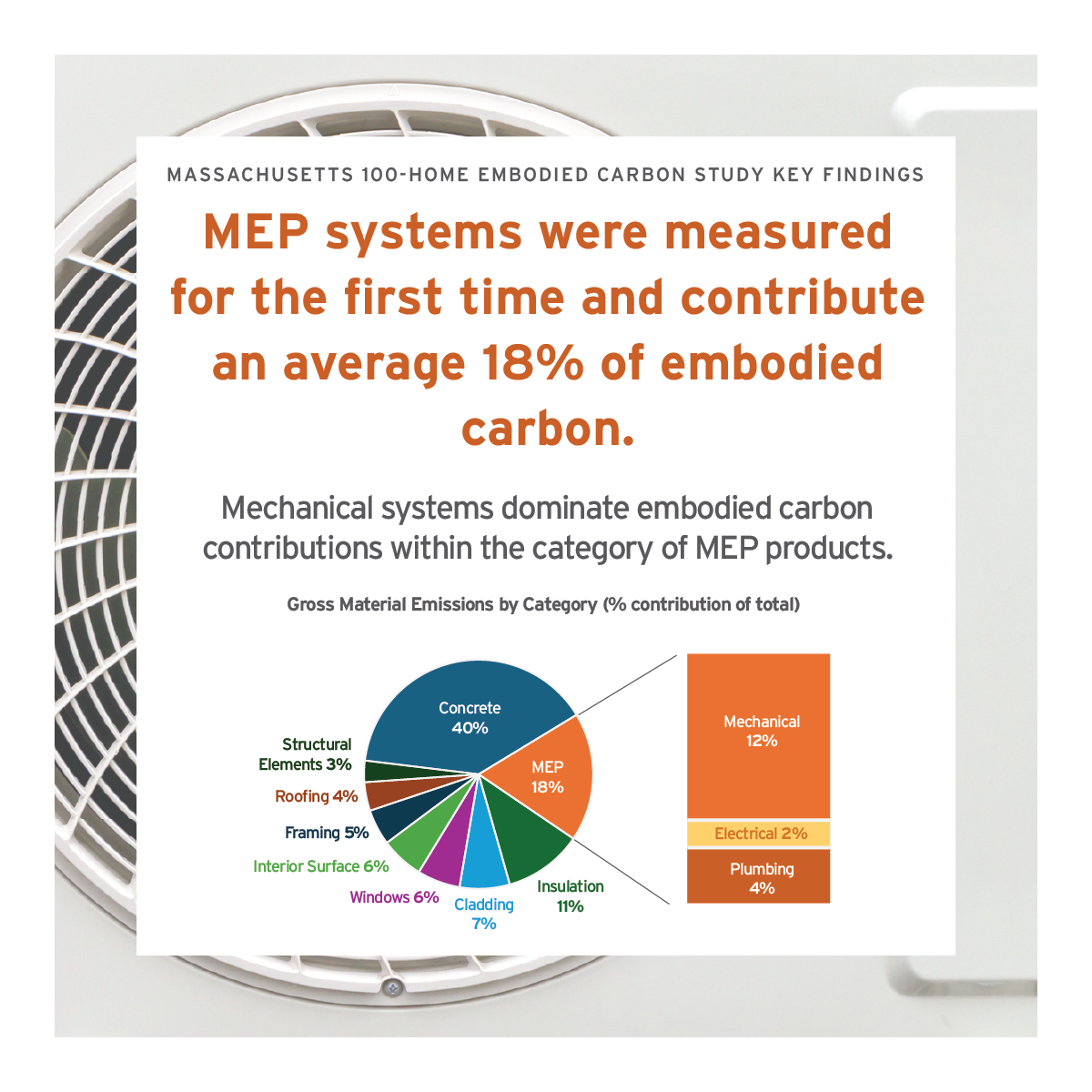 4. Roughly 18% of a new home’s embodied carbon comes from MEP (mechanical, electrical and plumbing). This is the first time the RESNET/ICC 1550 default table has been used to demonstrate this significant contributor.
