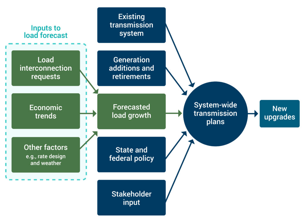 As shown in Exhibit 1, system-wide planning processes incorporate large loads through their load forecasts, one of several planning inputs. Planners forecast load by considering load interconnection requests together with macroeconomic trends, policy drivers, and other factors. RMI’s Get a Load of This report details large load forecasting further.