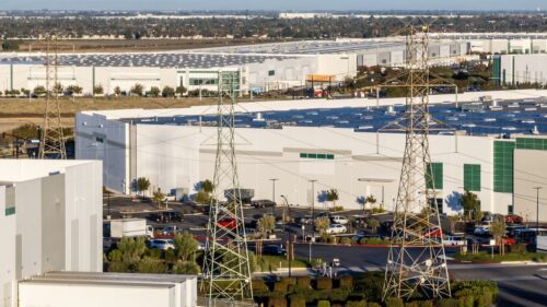 High angle, aerial view of a distribution center late in the afternoon.