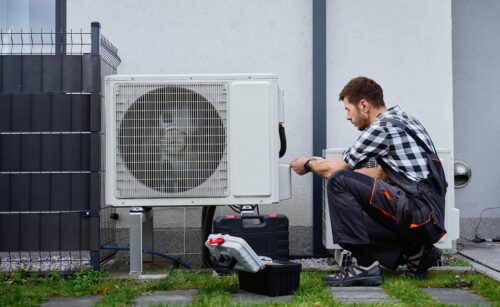 Technician performing maintenance on outdoor heat pump unit near residential building exterior. Man installing air source heat pump, using tools. Concept of HVAC service and heating system repair