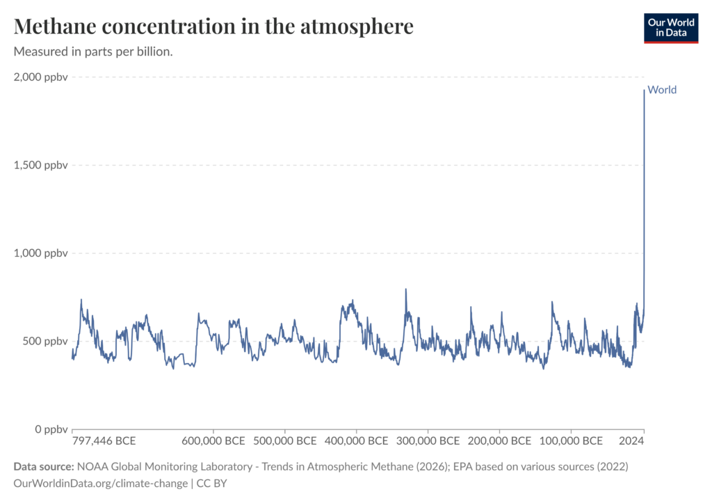 Methane was discovered in Italy 250 years ago due to bubbles arising from marshes. When collected and ignited, methane lit on fire and was initially called “swamp gas.” Although methane (chemical name CH4) has been steadily present in the Earth’s atmosphere at low levels for tens of thousands of years, its volume has increased dramatically since the Industrial Revolution due to increased fossil fuel use, agricultural expansion, and landfill development. In 2025, methane levels were at the highest ever recorded.