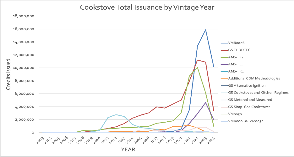 Historically, most cookstove credits come from Gold Standard's TPDDTEC methodology and the VCS's VMR0006 methodology (adapted from CDM AMS-II.G), which together are responsible for nearly 60% of all cookstove credits issued to date. A third major contributor is the CDM methodology AMS-II.G. These three methodologies likely dominated the early cookstove market for the following reasons: