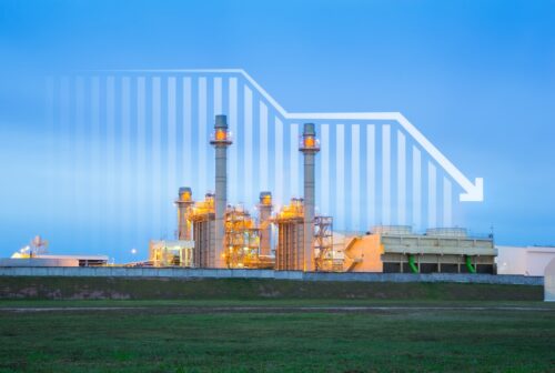 Power plant, gas fired power station. Include decreasing chart, graph. Industrial factory may called combined cycle gas turbine plant. Concept for low, loss, drop in electricity energy generation.