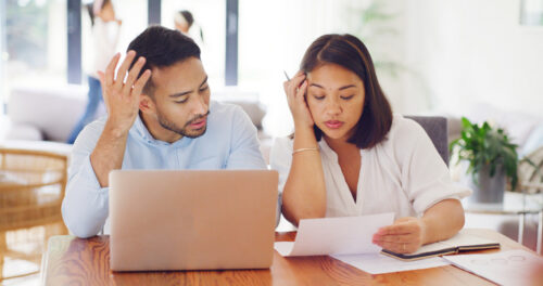 Finance, stress or couple in house with paper, payment pressure or bankruptcy in money management. Worry, tax review or people in home with laptop, missing bill or loss in poor financial planning